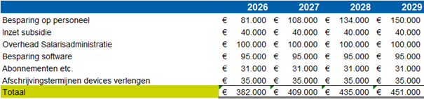 Op dit moment is hiervan reeds € 28.500 door ons gerealiseerd. Het restant van deze opgave bedraagt in 2026 € 52.500 oplopend tot € 121.500 in 2029. Deze reeks treft u hier aan.